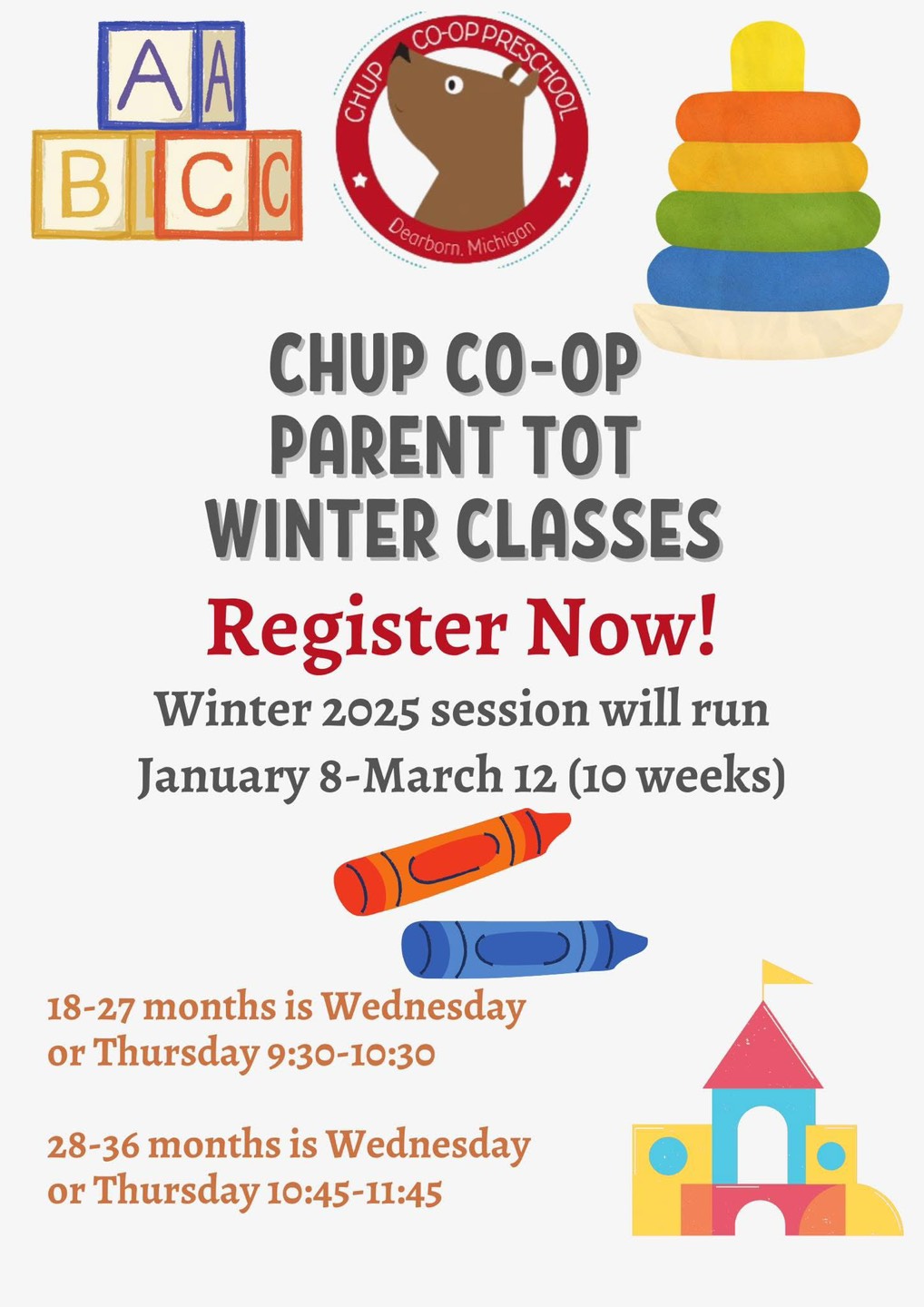 See the flyer below for more information and then head to Enrollment and scroll down to the Tot class. Or you can head here: CHUP Parent Tot Brightwheel Enrollment Link
